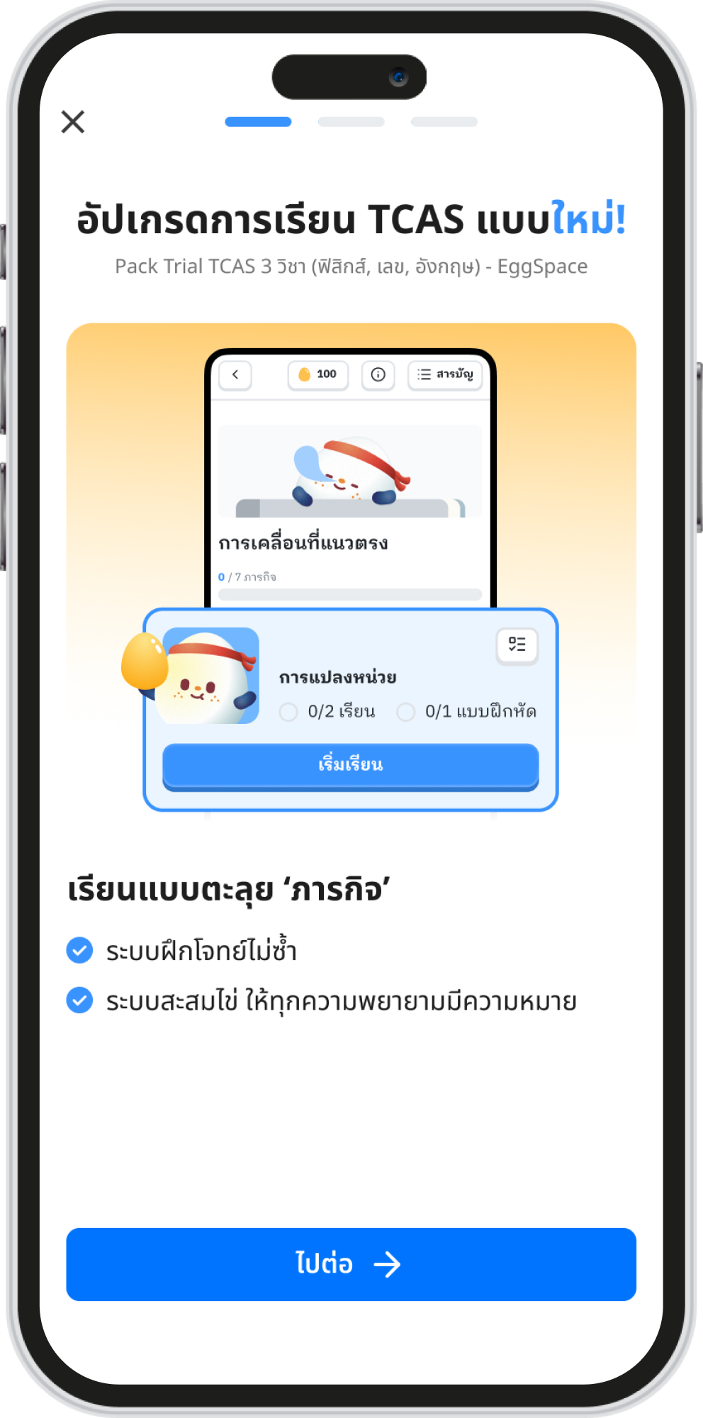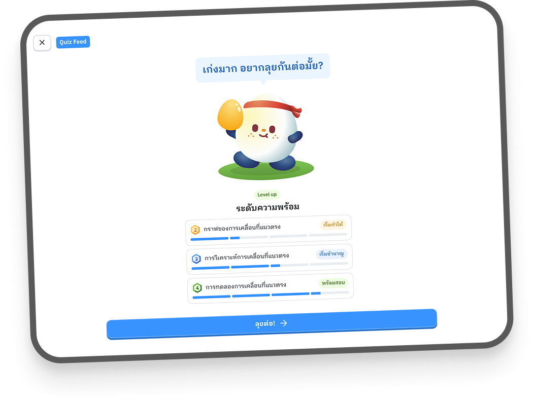 เพราะเรารู้ว่าการเรียนต่อเนื่องมันยาก เราจึงออกแบบระบบ Gamification ให้ทุกความพยายามของคุณมีความหมาย สะสม "ไข่" จากการทำภารกิจเพื่อ Level Up ตัวละครของคุณ